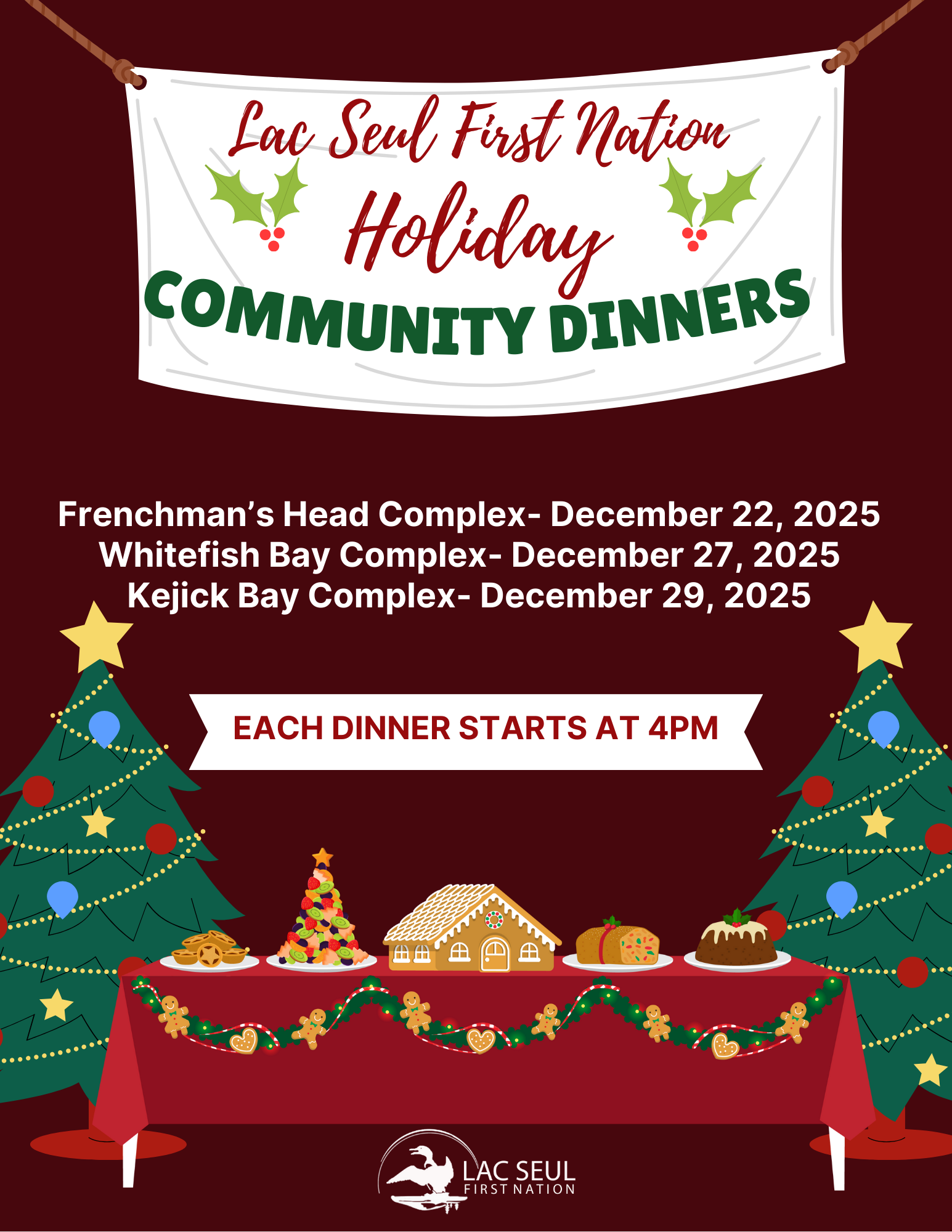 Back to All Events Community Holiday Dinner - KB Monday, December 29, 2025 4:00 p.m. 7:00 p.m. Kejick Bay Complex Lac Seul, ON, P0V 2A0 Canada (map) Google Calendar ICS