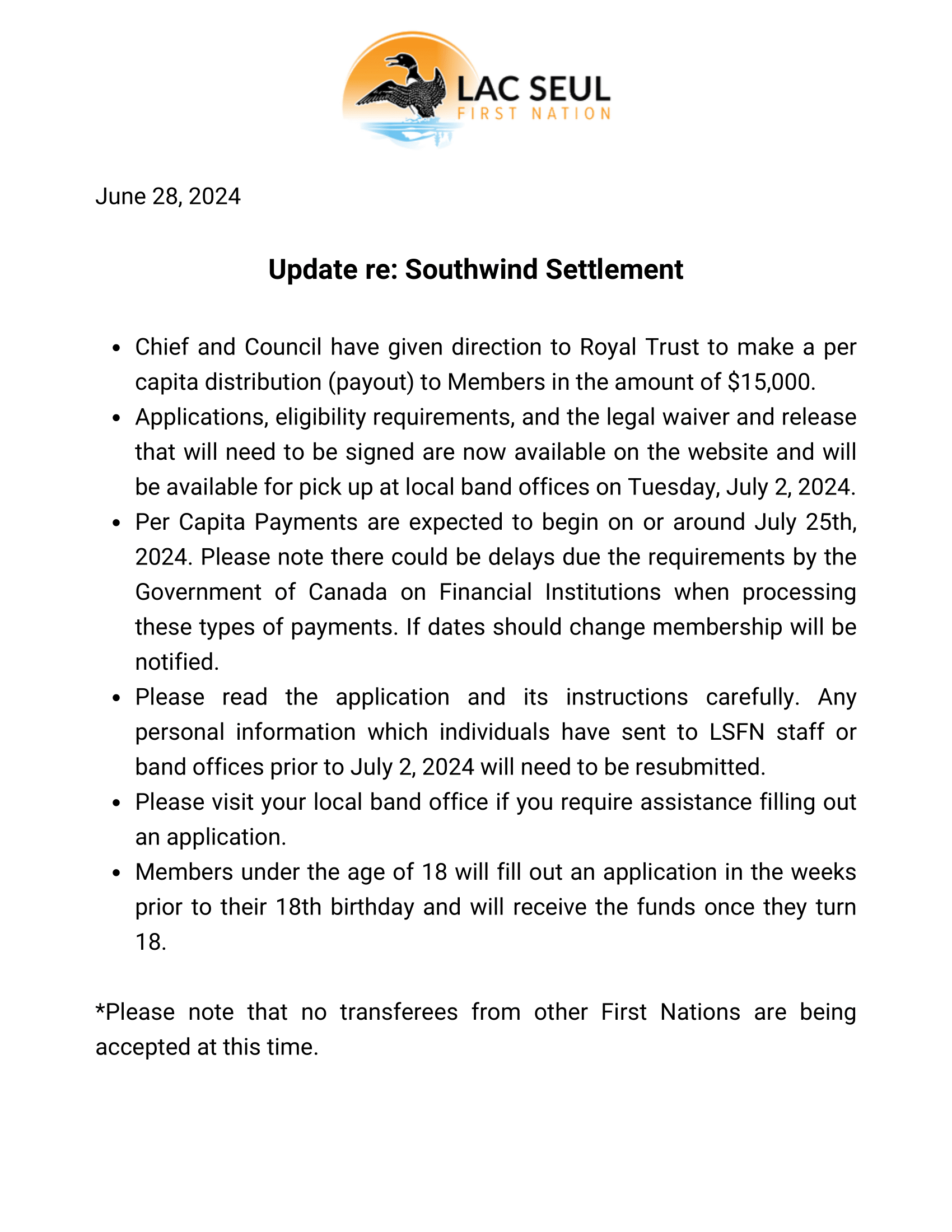 Between January and August, the First Nation and Canada have been meeting to negotiate a settlement for the Southwind case. Most recently, the Chief and Council met in Ottawa with Canada’s negotiators again on September 21st, and with Crown-Indigenous Relations Minister Marc Miller on September 22nd. The meetings were focused on getting to a final compensation number that can be presented to the LSFN membership for ratification. The parties are now close to a final compensation number, and the Chief and Council hope to report to the membership on the settlement amount soon.
