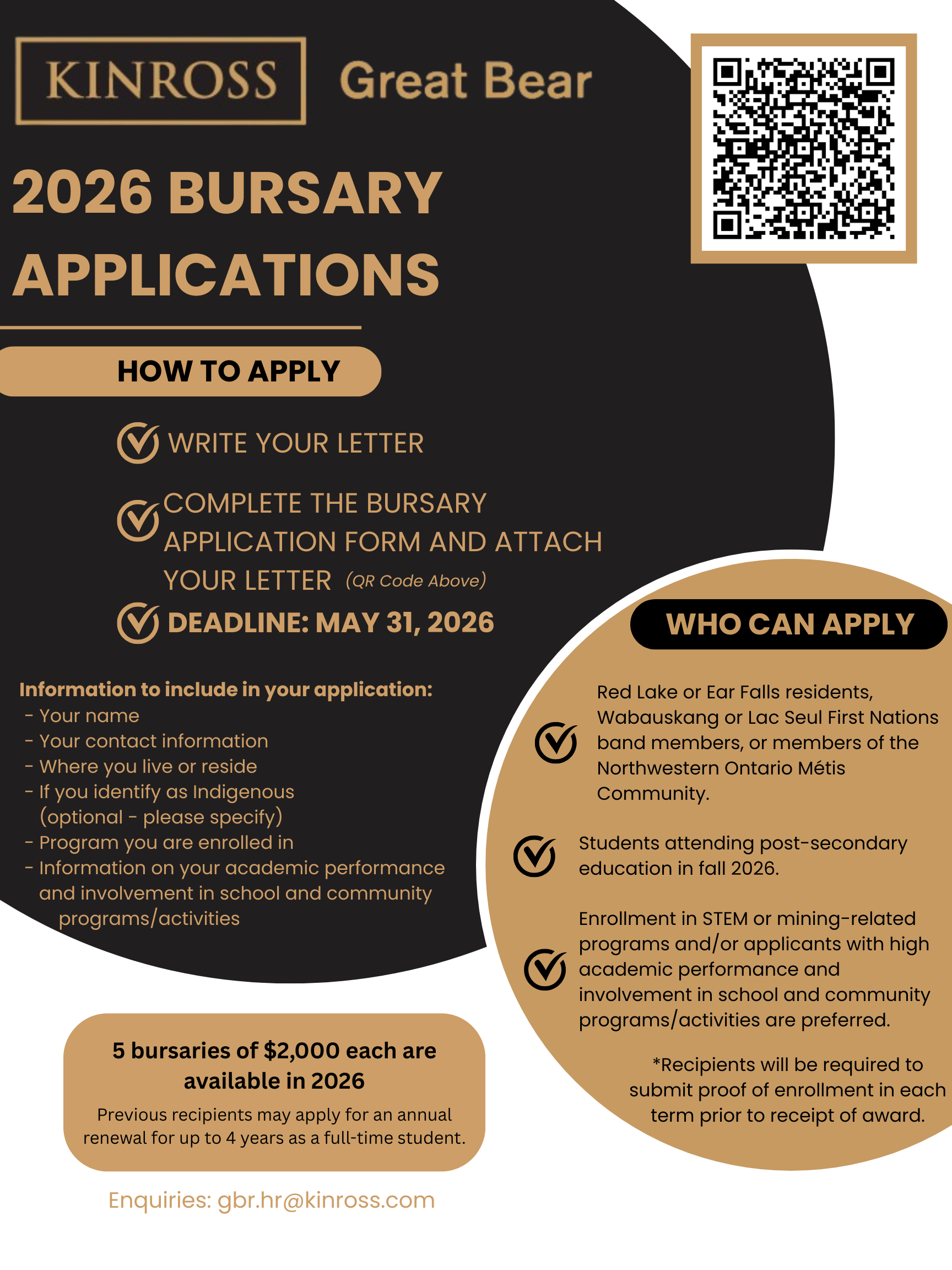 A new round of student bursaries has been announced for students in Red Lake, Ear Falls, Lac Seul, and Wabauskang who are planning to attend post-secondary education in the fall of 2026.