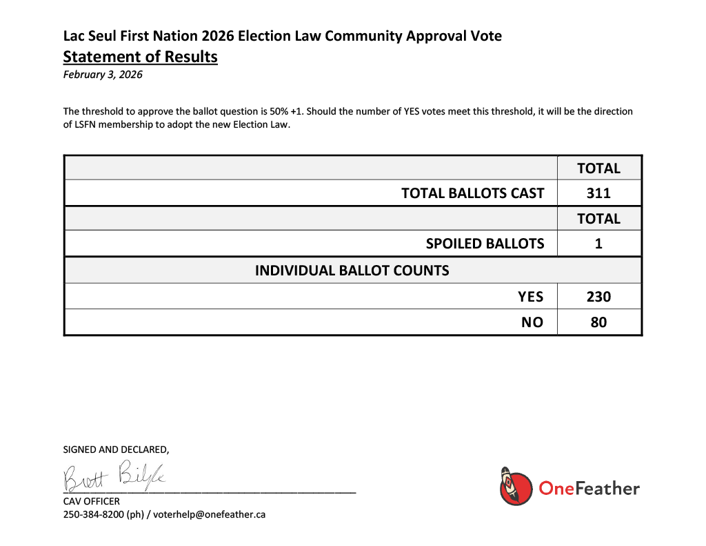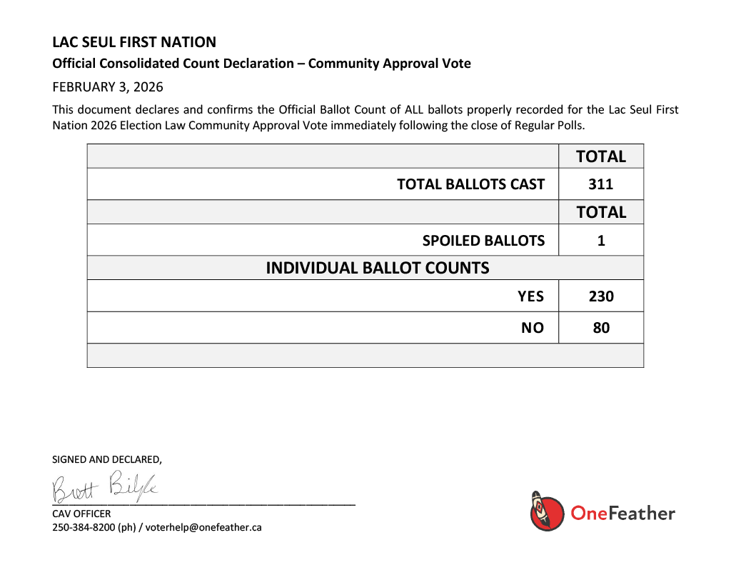 Lac Seul First Nation alongside the Good Governance Project and Metallic Law put forth a ratification vote for the new proposed election laws for LSFN. Voting took place between January 21 - February 3, 2026.